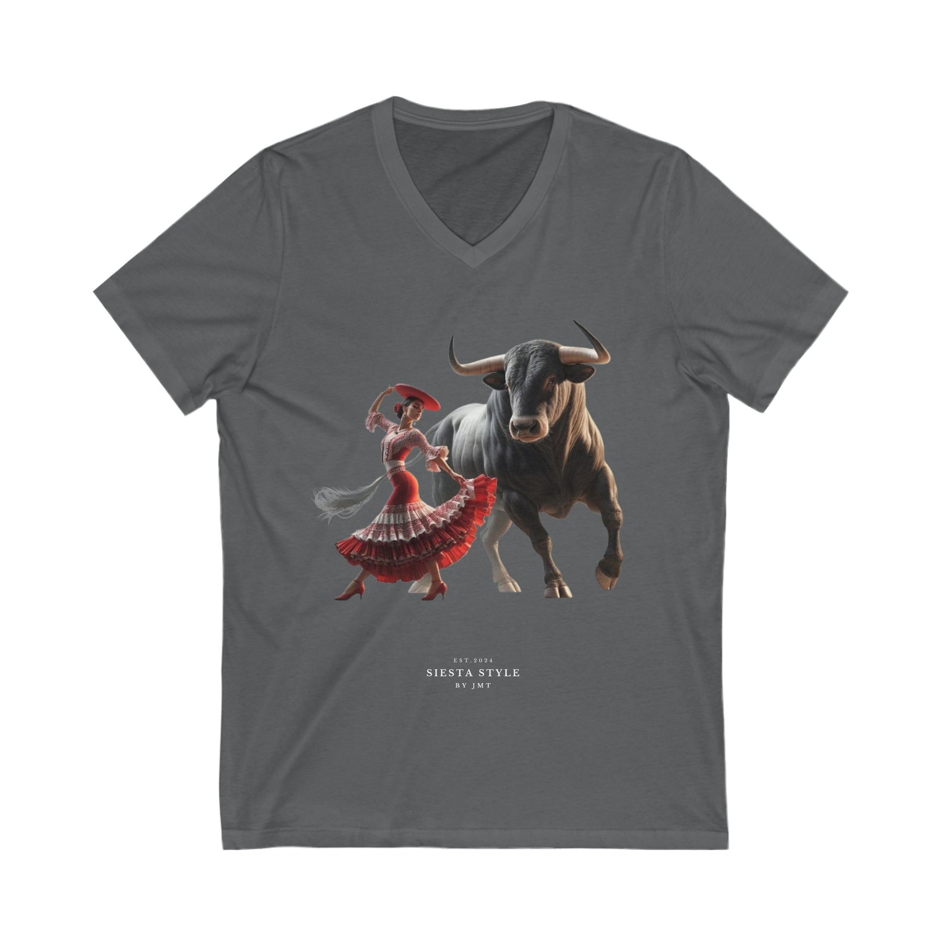 Cultural Fiesta V-Ausschnitt T-Shirt – Tanzende Frau & Stier Design | Siesta Style